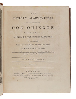 CERVANTES SAAVEDRA, Miguel de (1547-1616). [Don Quixote]. The History and Adventures of the Renowned Don Quixote. Tobias Smollett, translator. London: for A. Millar and others, 1755.