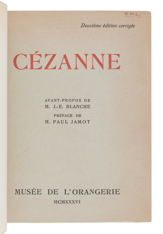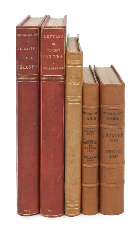 BERNARD, Emile. Lettres de Vincent Van Gogh A Emile Bernard. Paris: Ambroise Vollard, 1911. Original wrappers bound in. -- RIVIÈRE, Georges. Le Maître Paul Cézanne. Paris: H. Floury, Éditeur, 1923. Original wrappers bound in. -- MUSÉE DE L’ORANGERIE. Claude Monet. Exposition Rétrospective, 1931; Portraits et Figures de Femmes Pastels et Dessins, 1935; Cezanne, 1936, second edition; Degas, 1937; Exposition E. Vuillard, 1938; all published Paris: Musée National de l’Orangerie, 1931-1938. 5 exhibition catalogues bound in 2 volumes. Original wrappers bound in. Provenance: R.M.L. (signature); Edwin E. Hokin (signature); Grace and Edwin Hokin (bookplate). -- SEUPHOR, Michel. L'Art Abstrait. Ses origines, ses premiers maîtres. Paris: Maeght, 1950. Later edition. -- Together, 8 works in 5 volumes, 8vo, FIRST EDITIONS except where noted, all half morocco, condition generally fine.