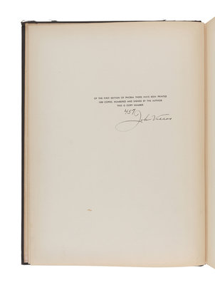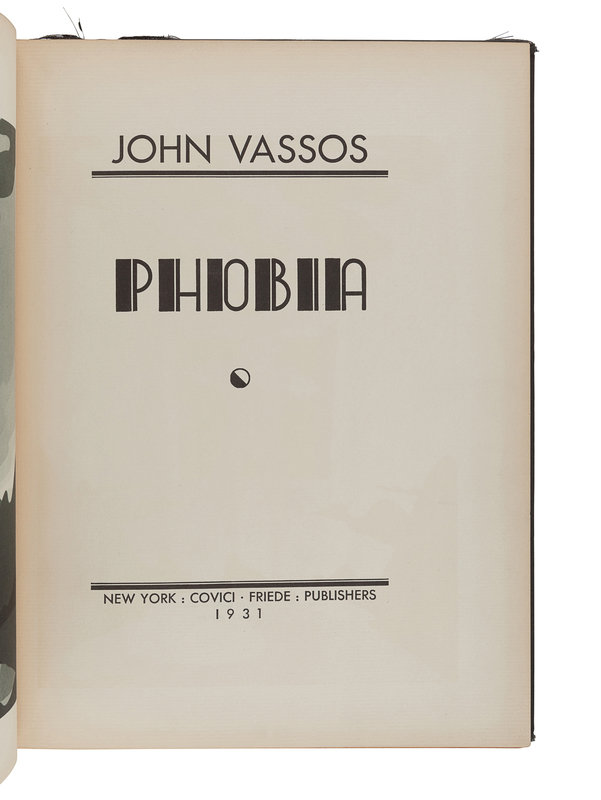 VASSOS, John (1898-1985). Phobia. New York: Covici Friede, 1931. 4to. Half-title, 24 plates in reproduction. Original publisher’s black cloth stamped in silver (slight wear to extremities, fading to spine, minor soiling). FIRST EDITION, LIMITED ISSUE, number 457 of 1,500 copies SIGNED BY VASSOS.