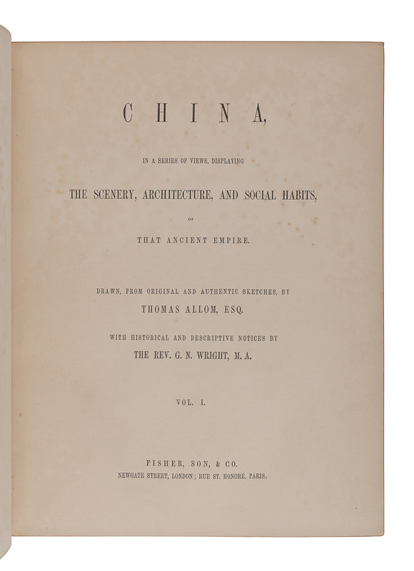 [CHINA -- TRAVEL & EXPLORATION]. ALLOM, Thomas (1804-1872), illustrator. -- WRIGHT, George Newenham (1794-1877). China in a Series of Views, Displaying the Scenery, Architecture, and Social Habits, of that Ancient Empire. London: Fisher, Son & Co., preface dated 1843.