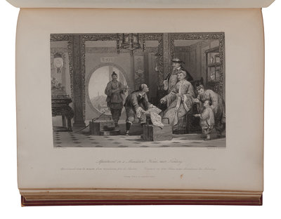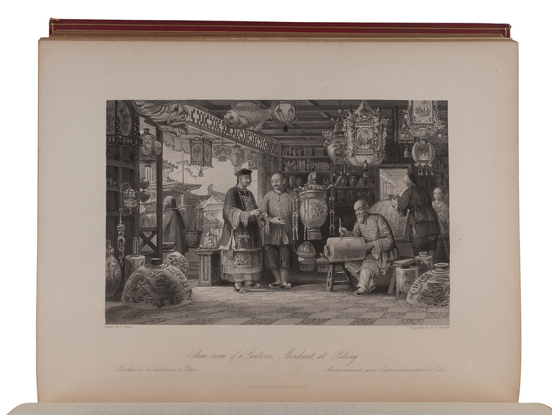 4to (268 x 210 mm). 4 volumes in 2. 128 steel-engraved plates (including 4 engraved titles) after Thomas Allom. (Some spotting to a few plates.) Contemporary red gilt-stamped morocco, edges gilt (rubbing to spine and extremities). Provenance: Blumenthal (bookplate). Later edition, with numerous plates after Allom illustrating “the scenery, customs, arts, manufactures, religious ceremonies and political institutions” of the Chinese people (preface).