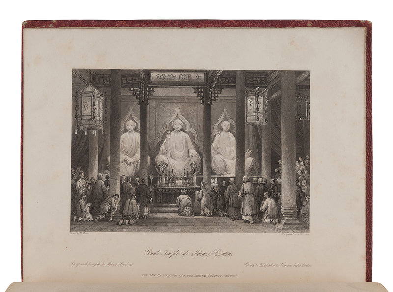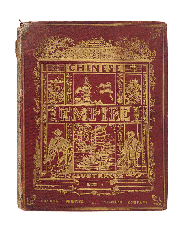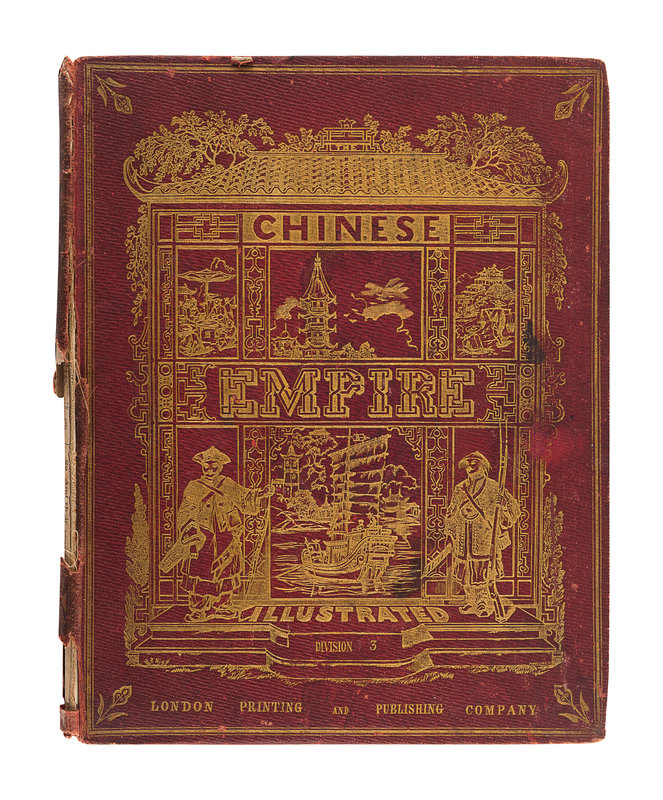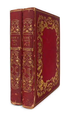 ALLOM. -- WRIGHT. Chinese Empire Illustrated. London: Printing and Publishing Company, [ca 1860]. 2 volumes (of 7), comprising vols. 3 and 4, 4to (267 x 214 mm). 48 steel-engraved plates, most after Thomas Allom. Original publisher’s gilt-stamped pictorial red cloth (spines defective, boards detached vol.4 and separating vol.3, wear). Provenance: Shirley Baker (signatures). Later edition.