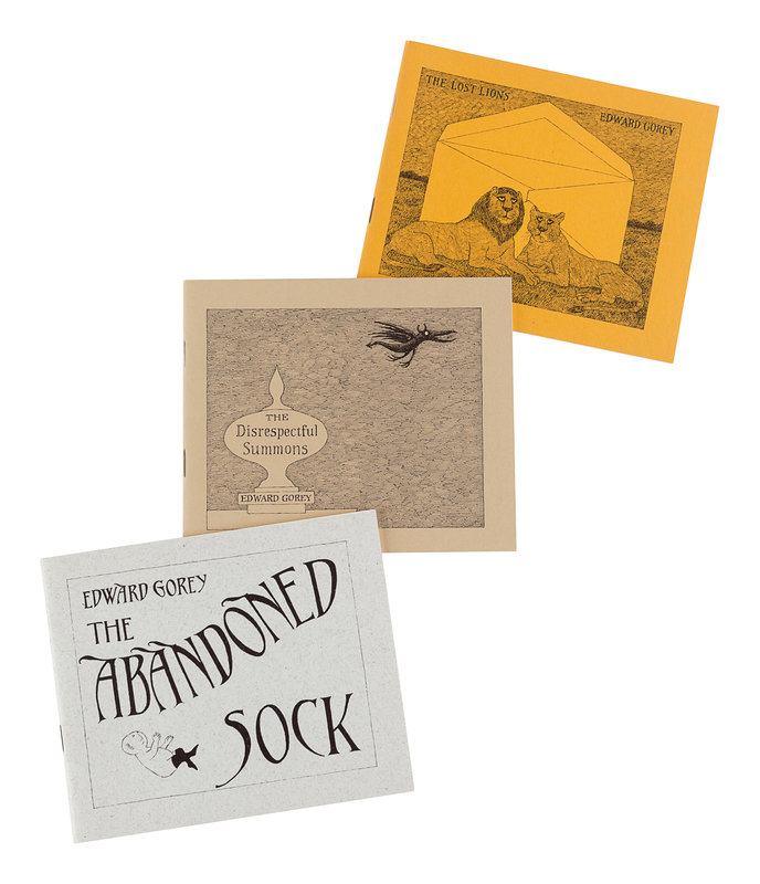 GOREY, Edward (1995-2000). Three Books from the Fantod Press, Set IV: The Abandoned Sock; The Disrespectful Summons; The Lost Lions. N.p.: The Fantod Press, 1973.