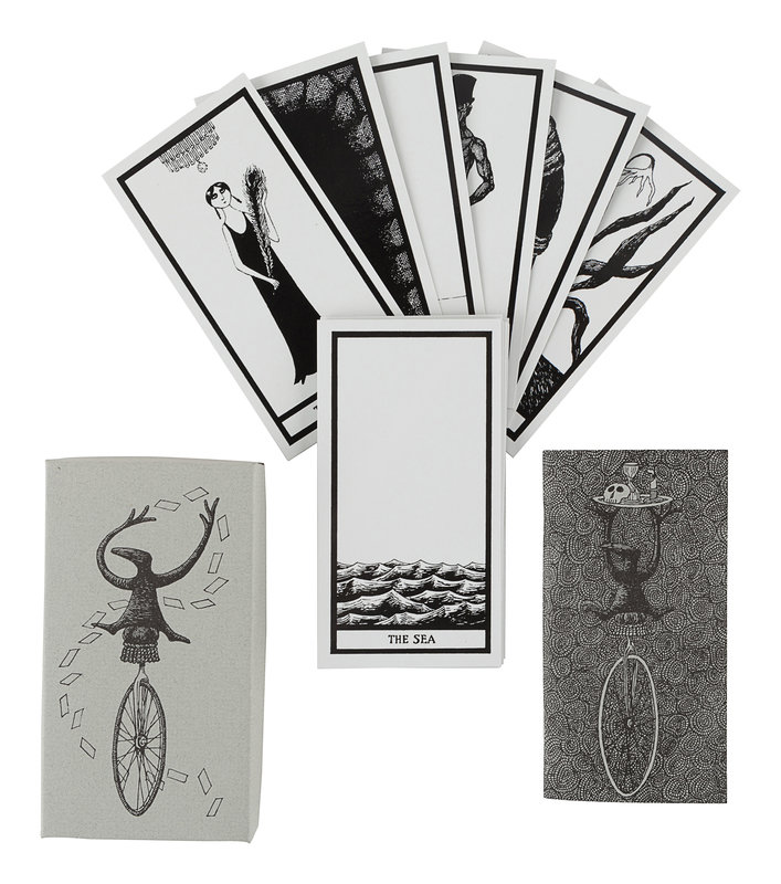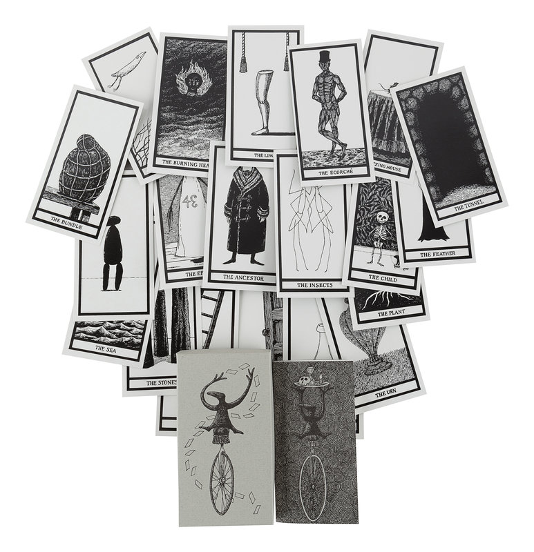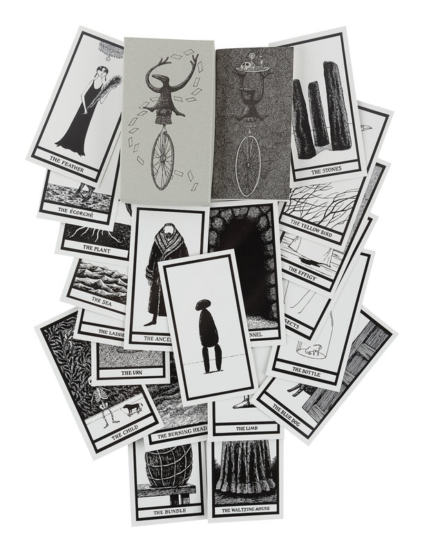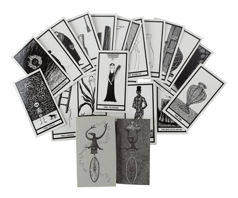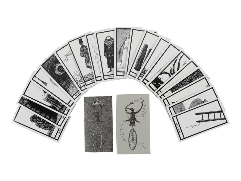 16mo. 20 laminated cards with illustrations by Gorey; text booklet of card interpretations. Text volume: original stapled grey pictorial wrappers. Cards loose as issued and housed with text volume in original gray pictorial box.