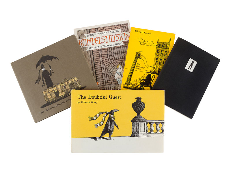 The Listing Attic [and] The Unstrung Harp. London: Abelard, 1974. FIRST ENGLISH EDITION. Toledano A2e. -- The Doubtful Guest. New York: Dodd, Mead & Co.,1978. Reprint. Toledano A3d. -- The Gashlycrumb Tinies. New York: Peter Weed, [1992]. Reprint. Toledano A11f. -- The Black Doll. New York: Gotham Book Mart, 1973. FIRST TRADE EDITION. Toledano A49c. -- TARCOV, Edith H. Rumpelstiltskin. Illustrated by Gorey. New York, etc.: Scholastic Book Services, 1973. FIRST EDITION. Toledano B57a. -- Together, 5 works in 5 volumes, all in original publisher's bindings as issued. EACH SIGNED BY GOREY on the title-page. Condition generally fine.