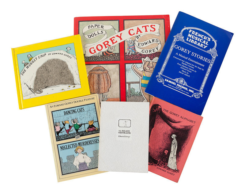 The Gorey Alphabet. London: Constable, 1960. FIRST ENGLISH EDITION of The Fatal Lozenge. Toledano A6c. -- Wuggly Ump. New York: Adama, 1963 [but 1983]. Reprint. Toledano A15d. -- Dancing Cats and Neglected Murderesses. New York: Workman, 1980. FIRST TRADE EDITION. Toledano A77c. -- La Balade Troublante. N.p.: The Fantod Press, 1991. FIRST EDITION. Toledano A103. -- Gorey Cats. Paper Dolls. San Francisco, Troubadour Press, 1982. FIRST EDITION. Toledano B67. -- Gorey Stories: A Musical Entertainment. New York: Samuel French, Inc., 1983. Second edition. Toledano C29b. -- Together, 6 works in 6 volumes, all in original publisher's bindings as issued. EACH SIGNED BY GOREY on the title-page. Condition generally fine.