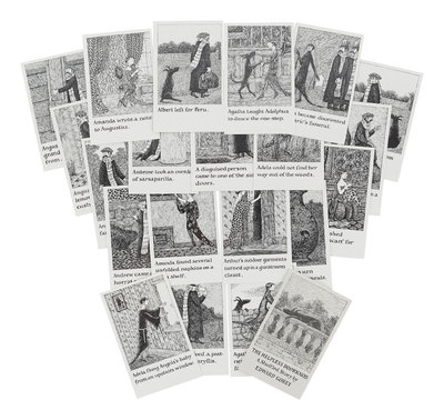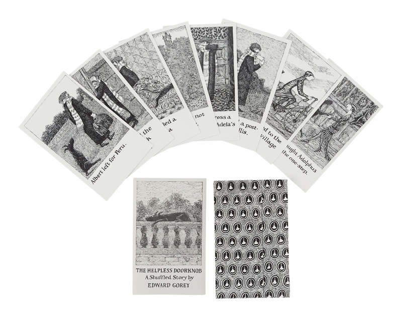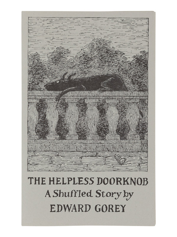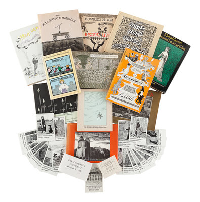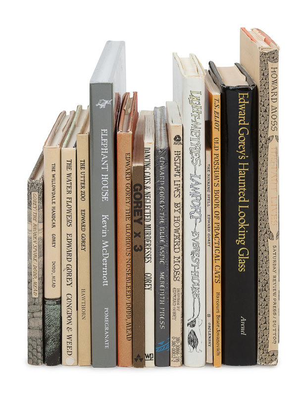 The Willowdale Handcar or the Return of the Black Doll. 1979. Reprint. Toledano A10d. -- The Sinking Spell. 1964. Toledano A17a. -- The Utter Zoo. N.d. Reprint, fourth issue. Toledano A26b. -- The Blue Aspic. [1968 or later]. Original shrinkwrap (edition unknown). See Toledano A27. -- The Glorious Nosebleed. 1975. FIRST TRADE EDITION. Toledano A59c. -- The Broken Spoke. 1976. FIRST TRADE EDITION. A63c. -- Dancing Cats and Neglected Murderesses. 1980. FIRST TRADE EDITION. Toledano A77c. -- The Water Flowers. 1982. FIRST EDITION. Toledano A84a. -- The Helpless Doorknob. 1989. FIRST EDITION, second printing. Toledano A95b. -- The Dancing Rock. -- The Floating Elephant. 1993. FIRST TRADE EDITION. Toledano A108b. -- The Pointless Book: or, Nature & Art. N.p., 1993. FIRST TRADE EDITION. Toledano A109b. -- Edward Gorey's Haunted Looking Glass. 1984. Later reprint. Toledano B9d. -- MOSS, Howard. Instant Lives & More. 1974. FIRST TRADE EDITION. Toledano B58b. -- Another copy. First paperback edition. Toledano B58c. -- Gorey X 3. 1976. FIRST EDITION. Toledano B62. -- LAMPORT, Felicia. Light Metres. 1982. Later edition. Toledano B69d. -- ELIOT, T. S. Old Possum's Book of Practical Cats. 1982 or later. See Toledano B70. -- McDERMOTT, Kevin. Elephant House or, The Home of Edward Gorey. [2003 or later]. Original shrinkwrap (edition unknown). -- Together, 18 works in 18 volumes, all in original publisher's bindings as issued, condition generally fine.