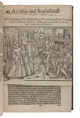Second edition of Cranmer's work repudiating the doctrines of transubstantiation, reprinted with a life of Cranmer. The plates depict his condemnation and death. The rectos of 2 leaves (N3 and Ff2) with portion of a headline in Latin present upside down in the lower margin: "The Latin headlines in rules appearing upside down at the foot of several versos in some copies indicate unused sheets of STC 11239 were employed in the printing" (STC 5992). ESTC S107277.