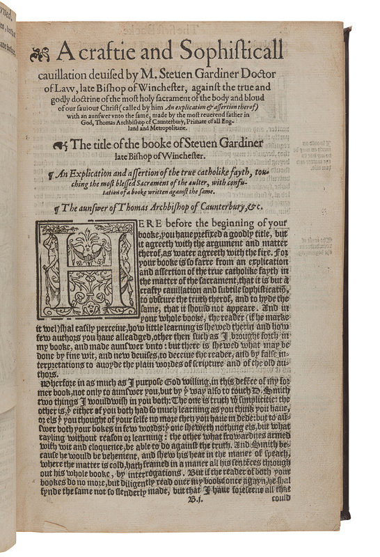 CRANMER, Thomas (1489-1556). An Aunswer by the Reverend Father in God Thomas Archbyshop of Canterbury...Unto a craftie and Sophisticall cavillation, devised by Stephen Gardner...agaynst the true and godly doctrine of the most holy Sacrament of the body and bloud of our Savior Jesu Christ. London: John Daye, 1580.