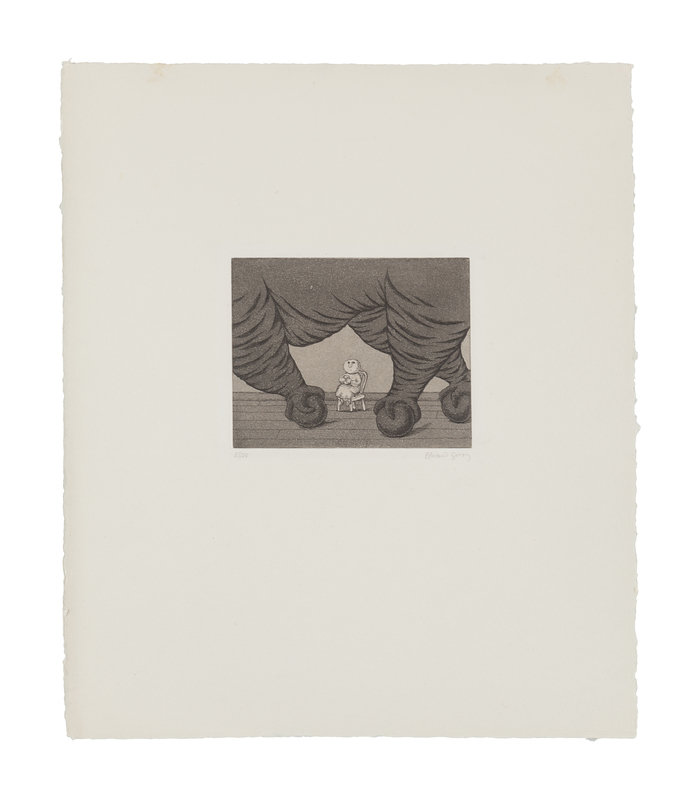 Etching, on Arches paper, 14 x 11 3/4 in., SIGNED BY GOREY and numbered in pencil lower margin, 5/120. (Small surface abrasions to margins verso, cloth tape from framing upper margin verso, small pale stain upper margin.)