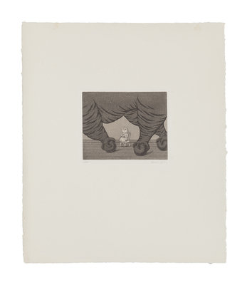According to Rick Jones of the Edward Gorey House, the common title for this etching, "Baby seated Under Rolling Elephant," is incorrect. This correct title appears in the original Diogenes brochure for this set of prints. One of 6 etchings created by Gorey and distributed by Diogenes Verlag in 1975, each consisting of 120 Arabic numbered and 20 Roman numbered copies. Though the etchings were sold individually, they are considered a set. VERY RARE: according to online records, no complete set of all 6 etchings has ever sold at auction, and no copy of this etching has ever sold at auction. See Goreyana Blogspot, 4 April 2011.