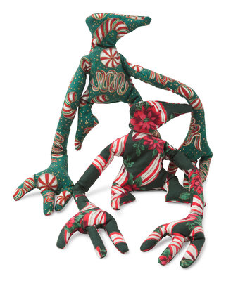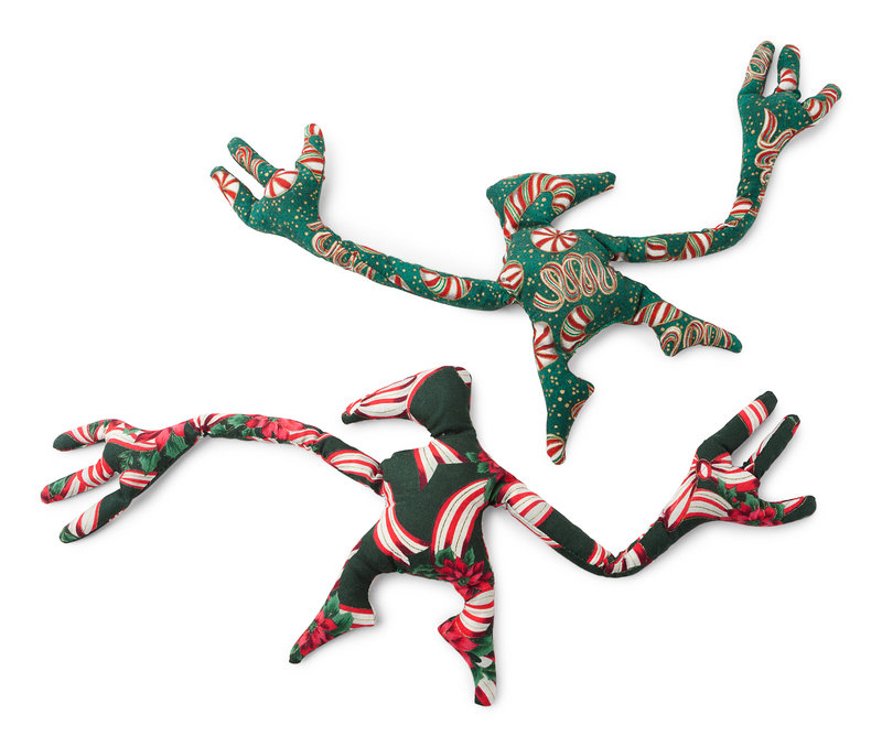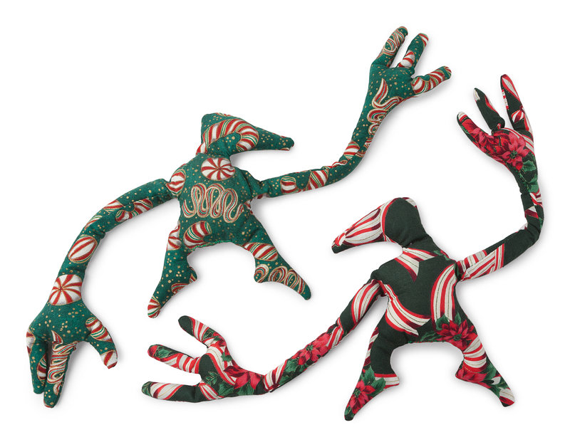 Cloth dolls, filled with rice, each approximately 7-in. tall with approximately 19-in. wingspan. 2 Figbash characters in holiday-themed cloth: one in green cloth with peppermint candy desigh, one in green cloth with poinsettia design.