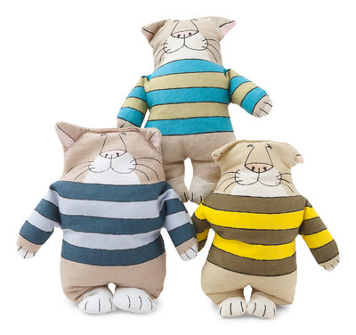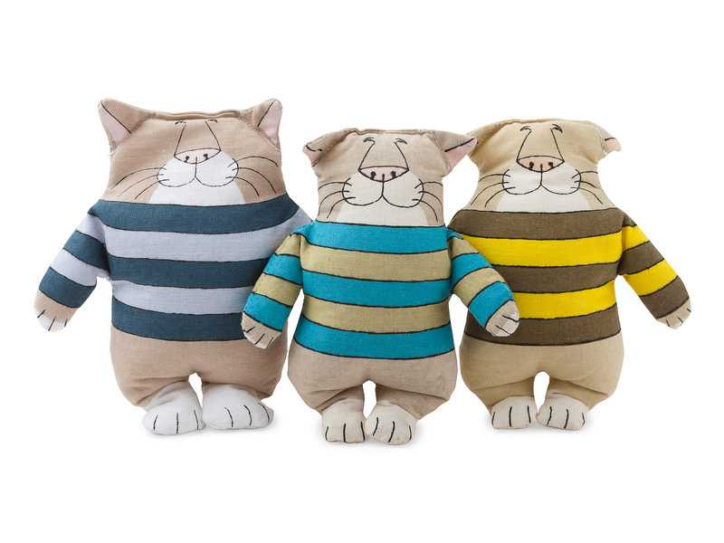Cloth dolls, filled with rice, each approximately 6 1/2-in. tall. Cats in different color shirts: lavender and gray striped, yellow and brown striped, and blue and green striped.