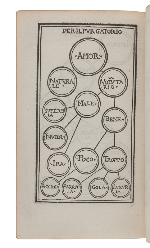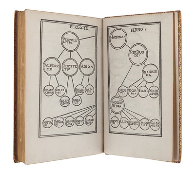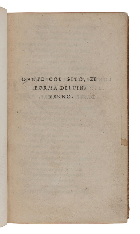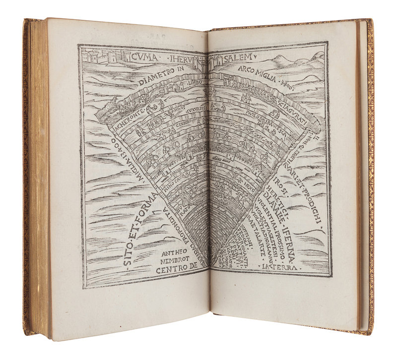 8vo (154 x 92 mm). Double-page woodcut depicting Jerusalem and the descent through purgatory and hell, double-page woodcut diagram of hell, full page woodcut diagram of purgatory. 3-line initial spaces with guide-letters, Roman and Italic types, with blanks I2 and H7. 19th-century morocco gilt, edges gilt. Provenance: Broughton (book label).