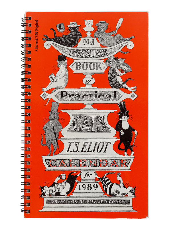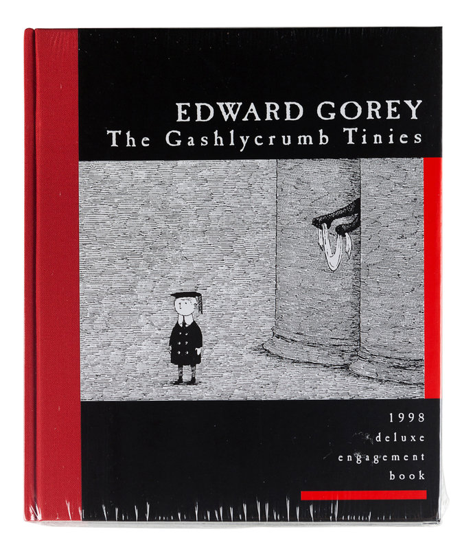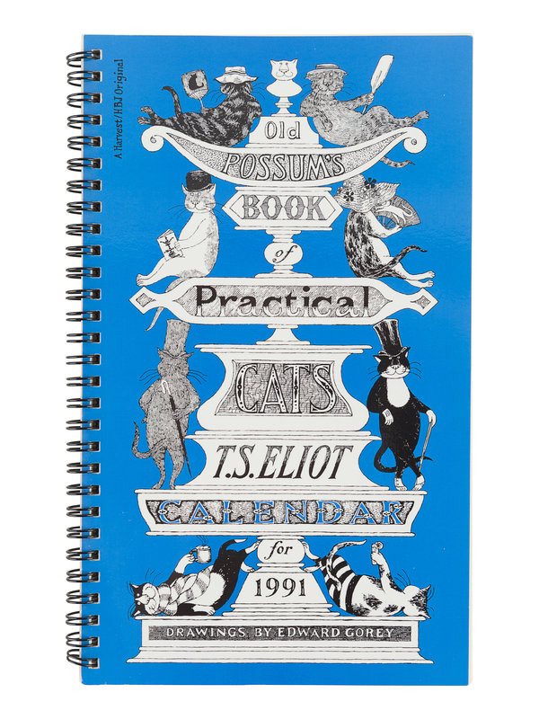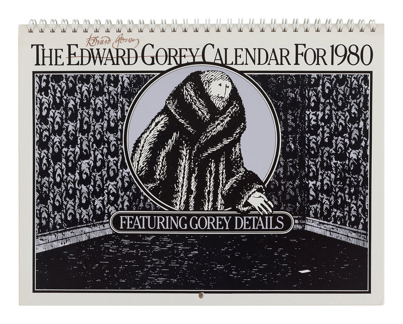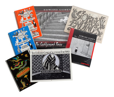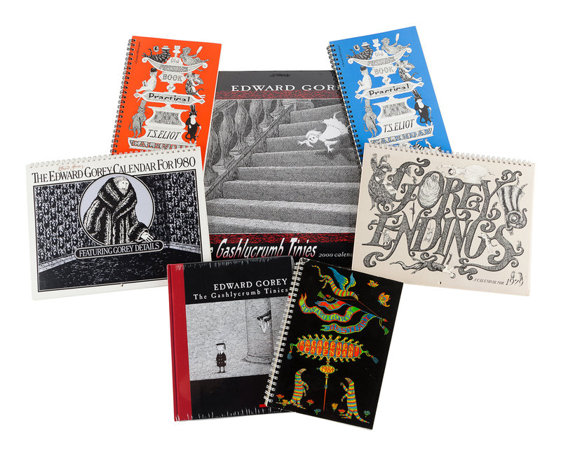 Gorey Endings, 1979. Spiral bound wall calendar. -- The Edward Gorey Calendar for 1980. Spiral bound wall calendar, with original printed envelope. SIGNED BY GOREY on the cover. -- An Edward Gorey Bestiary, 1984. Spiral bound engagement calendar. SIGNED BY GOREY on the title-page. -- The Old Possum's Book of Practical Cats T. S. Eliot Calendar for 1989. Spiral-bound engagement book. SIGNED BY GOREY on the title-page. -- The Old Possum's Book of Practical Cats T. S. Eliot Calendar for 1991. Spiral-bound engagement book. SIGNED BY GOREY on the title-page. -- The Gashlycrumb Tinies, 1998. Deluxe engagement book. As new in original shrinkwrap. -- The Gashlycrumb Tinies, 2000. Wall calendar. As new in original shrinkwrap. -- Together, 7 calendars, all in fine unused condition, most SIGNED BY GOREY.