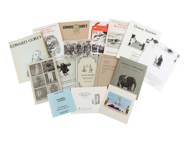 [With:] 3 exhibition announcement cards, including 2 SIGNED BY GOREY. -- [POSTER]. Soho Weekly News. Gorey Scenes from Transylvania. 4to. SIGNED BY GOREY. -- 3 Gotham Book Mart catalogues. -- 4 additional checklists and dealers' catalogues. -- Together, 16 items, condition generally fine, complete list available on request.
