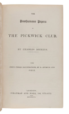 FIRST ENGLISH EDITION IN BOOK FORM, PUBLISHER'S PRESENTATION COPY inscribed on verso of original wrapper. An EXTRA ILLUSTRATED copy of Dicken’s first novel. With all Smith's first issue points present except signature E is present on p.25. Gimbel A16 and H1137; Hatton & Cleaver 3-88; Smith 3