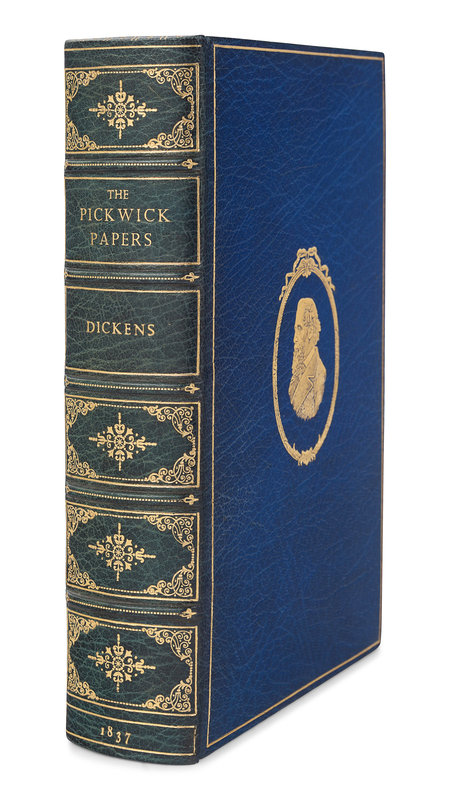 8vo (206 x 128 mm). 43 engraved plates (including engraved title) by R. Seymour (6), R.W. Buss (2), and Hablot K. Browne [“Phiz”] (35). EXTRA-ILLUSTRATED by the addition of 24 plates (some toning as usual, expert repair to lower corner of plate facing p.484.) 20th-century royal blue levant gilt, upper cover with gilt-stamped portrait of Dickens gilt-stamped, facsimile signature gilt on rear board, spine in 6 compartments with 5 raised bands, gilt-lettered in 2, the rest gilt-decorated, turn-ins gilt, edges gilt, STAMP SIGNED BY BAYNTUN; original front wrapper of Pailthorpe's Illustrations bound in: “with the publisher’s compliments.”