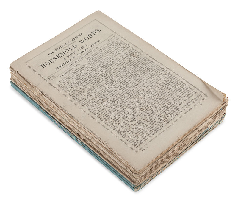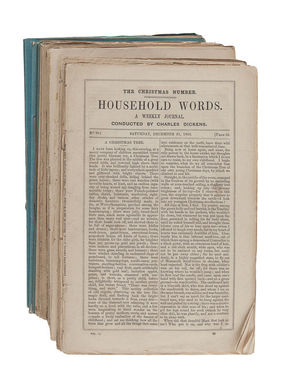 FIRST EDITIONS of the Christmas numbers from Household Words and All the Year Round including the stories ‘A Christmas Tree,’ ‘What Christmas Is, As We Grow Older,’ ‘The Holly-Tree Inn,’ ‘Somebody’s Luggage,’ ‘A Message from the Sea,’ ‘Mrs. Lirriper’s Lodgings,’ and several others. Gimbel E9-E20, E113-E118.