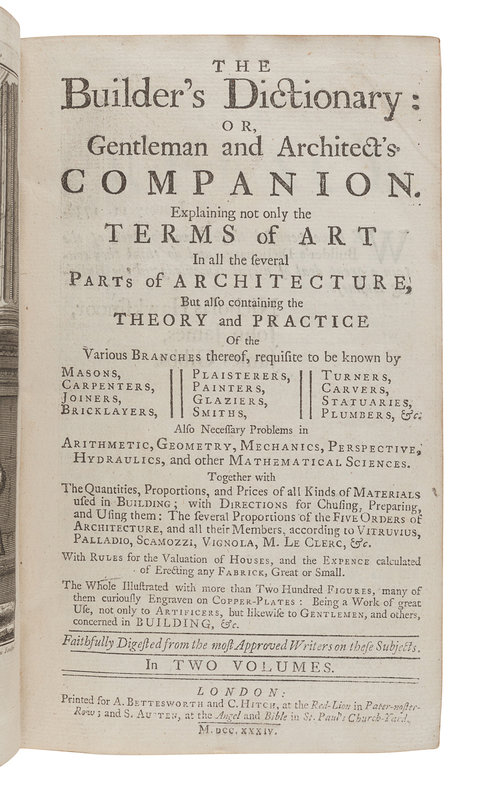[ARCHITECTURE]. The Builder's Dictionary: or, Gentleman and Architect's Companion. London: A. Bettesworth, C. Hitch, and S. Austen, 1734.