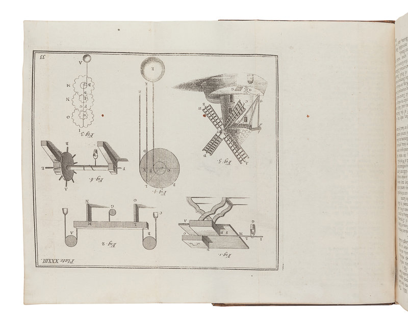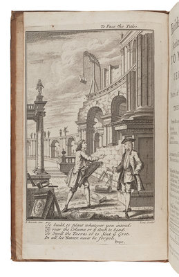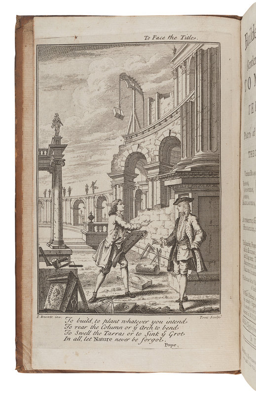 2 volumes, 8vo (200 x 107 mm). Engraved frontispiece, 34 plates folding engraved plates on 33 leaves, several full-page woodcut illustrations. With the approbation leaf in vol.II (not mentioned in RIBA), and with the two supplements and the errata leaf. Contemporary calf gilt, red morocco lettering-pieces gilt (neatly rebacked preserving original spine, slight chipping to one lettering-piece, some minor rubbing). Provenance: George Armstrong (signature dated 1735).
