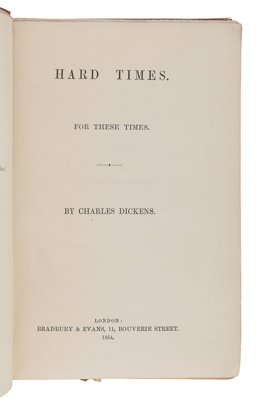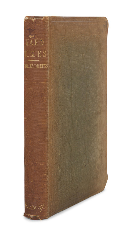 FIRST EDITION IN BOOK FORM, IN THE FIRST BINDING. Hard Times, Dickens's tenth novel, was first serialized in Household Words in 1854. One of two novels by Dickens without illustrations, the other being Great Expectations. Gimbel A136; Sadleir 689; Smith I:11.