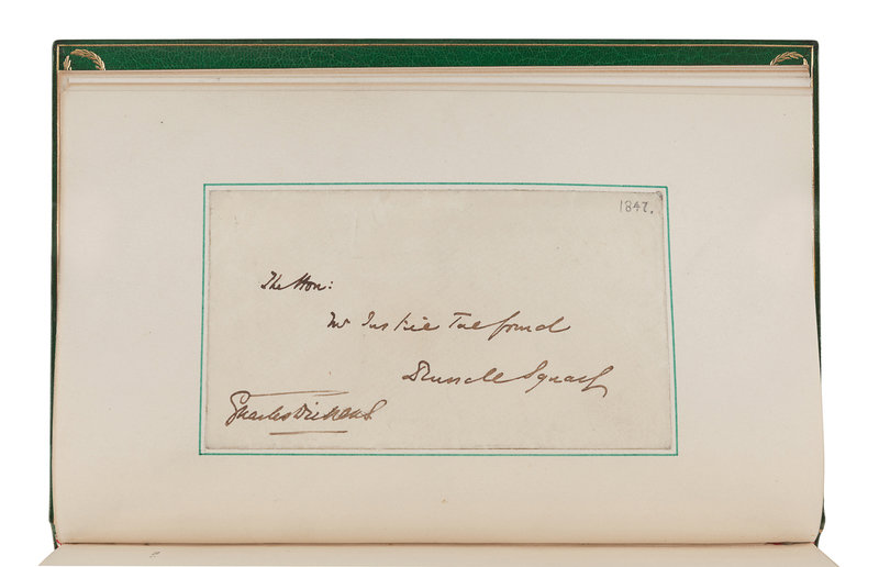 [Tipped in:]: AN ORIGINAL AUTOGRAPH DOCUMENT SIGNED BY DICKENS (“Charles Dickens”), an envelope addressed to English judge, author, and Radical politician Thomas Noon Talfourd (1795-1854) (“The Hon: / Mr Justice Talfourd / Dundee? Square”). With Dickens’ blue stamp to envelope closure.