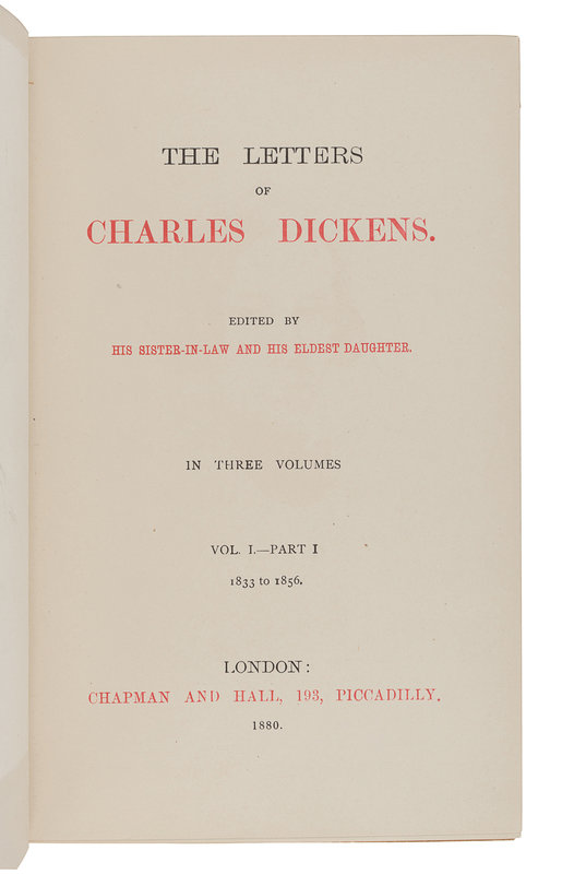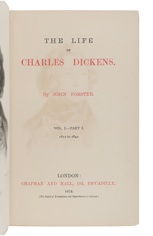 [DICKENS, Charles]. FORSTER, John. The Life of Charles Dickens. London: Chapman and Hall, 1872-1874. -- Letters of Charles Dickens. London: Chapman and Hall, 1880-1882.