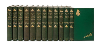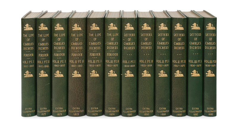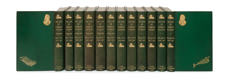 Together, 6 volumes expanded to 12, 8vo (214 x 135 mm). Half-titles in first volume of each part, titles printed in red and black. EXTRA ILLUSTRATED by the addition of 500 engraved plates. 20th-century green morocco gilt, sides with gilt-stamped portraits of Dickens, with gilt-stamped variations of his signature, spines gilt, wide turn-ins gilt, top edges gilt, others uncut, STAMP SIGNED BY RIVIERE AND SON (minor sunning to a few volumes, very occasional scuff, otherwise fine and bright).