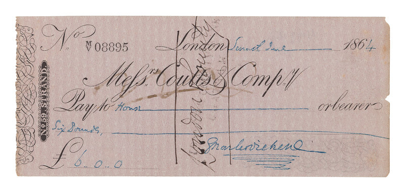 [DICKENS, Charles]. Autograph document, signed ("Charles Dickens"), a check, drawn on Coutts Bank, payable to "House, £6.00." London, 7 June 1864.