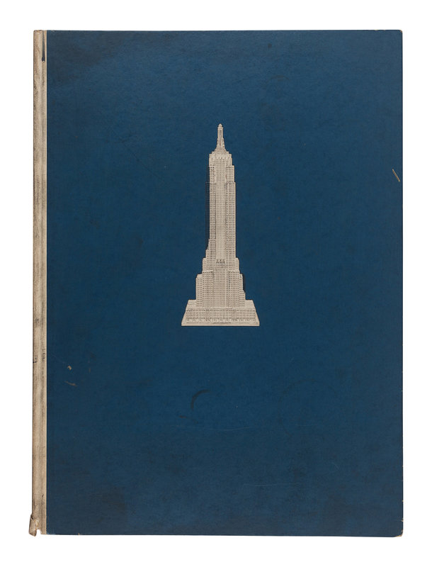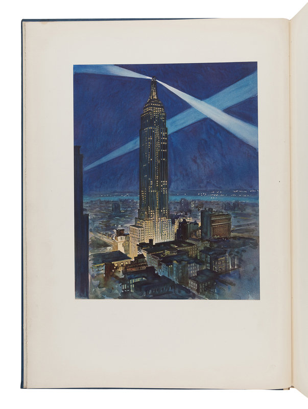 Large folio. Color frontispiece, 25 plates after drawings by Bailey. Original half white and blue paper boards, embossed image of the Empire State Building on upper board (tear at base of spine, soiling, slight rubbing to extremities).