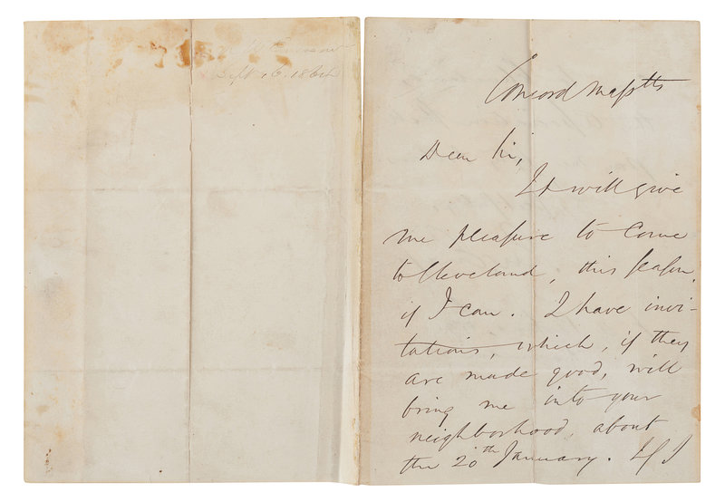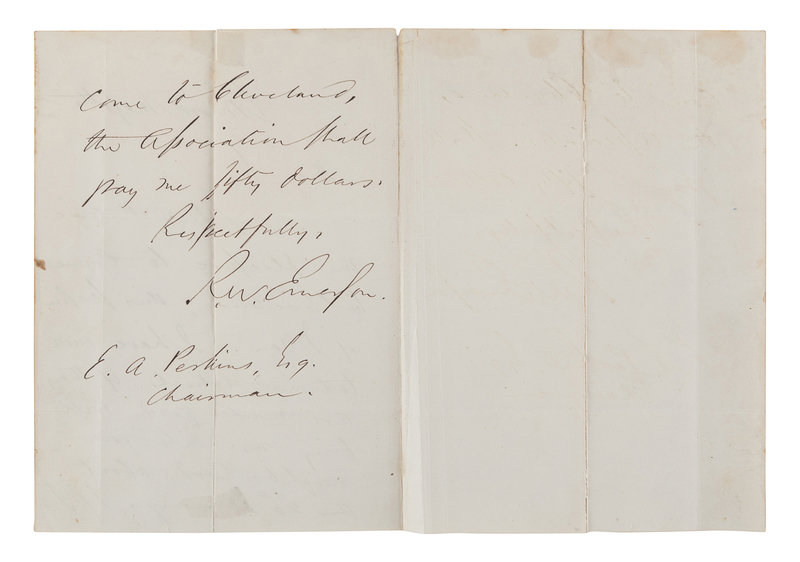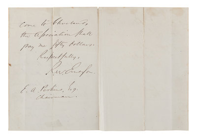 [Laid in:] Autograph letter signed ("R. W. Emerson") to E. A. Perkins. Concord, MA, 6 September 1864. 2 pages, 8vo, separations to fold affecting text and signature. Responding to an invitation: "It will give me pleasure to come to Cleveland this season, if I can..."
