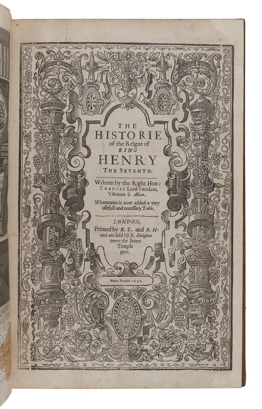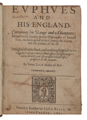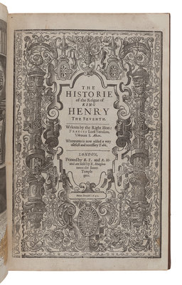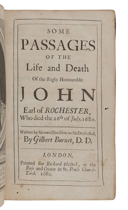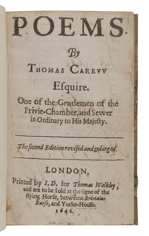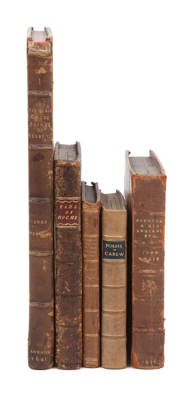 LYLY, John (1554?-1606). Euphues the anatomie of Wit. [London: J. Haviland for James Boler, 1631.] 2 parts in one volume, small 4to (163 x 115 mm). (Title trimmed.) Modern half morocco. Third edition. -- CAREW, Thomas (1595?-1645?). Poems. London: I. D. for Thomas Walkley, 1642. 12mo. Later half vellum. -- CRASHAW, Richard (1613?-1649). Steps to the Temple. London: For Humphrey Moseley, 1648. Engraved title-page. 20th century polished calf gilt. -- BACON, Francis (1561-1626). The Historie of the Raigne of King Henry the Seventh. London: R. T. and R. H., 1561. Folio. Later calf, upper cover with the monogram of Sir William Sterling Maxwell. Provenance: Sir William Stirling Maxwell (armorial bookplate, binding). -- BURNET, Gilbert (1643-1715). Some Passages of the Life and Death of...John, Earl of Rochester. London: for Richard Chiswel, 1680. 8vo. Engraved portrait frontispiece. Contemporary calf (neatly rebacked). -- Together, 5 works in 5 volumes, condition generally good.