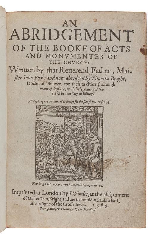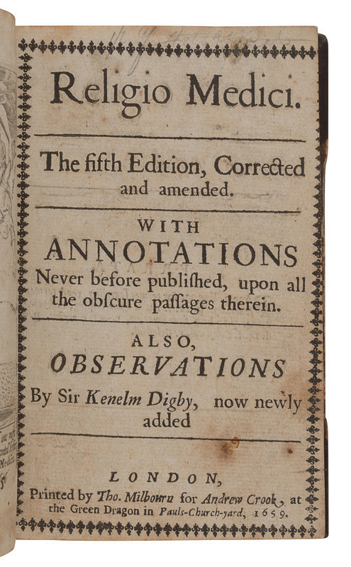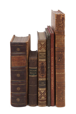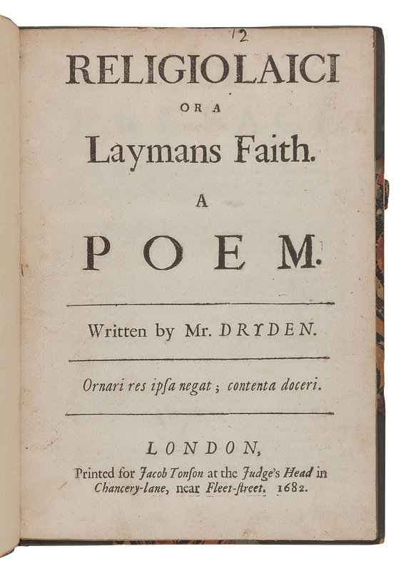 FOXE, John (1516-1587). [Book of Martyrs]. "An Abridgement of the Booke of Acts and Monuments...." London: I. Windet, 1589. 8vo. Woodcut device on title, woodcut headpieces and in initial borders. Contemporary reversed calf (rebacked). -- HUME, David. History of the Houses of Douglas and Angus. London: Evan Tyler, 1648. Later half calf. -- BROWNE, Thomas, Sir (1605-1682). Religio Medici. London: Tho. Milbourn for Andrew Crook, 1659. 12mo. Engraved frontispiece. Later half calf. -- DRYDEN, John (1631-1700). Religio Laici, or a Laymans Faith. London: for Jacob Tonson, 1682. Small 4to. Modern half green calf. Provenance: Edward Hale Bierstadt (engraved bookplate by E. D. French dated 1894); William Harris Arnold (1854-1823), American collector (bookplate). First edition, the issue with second line of imprint ending "in". --