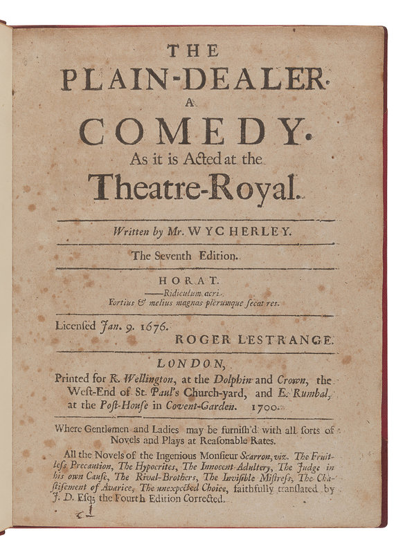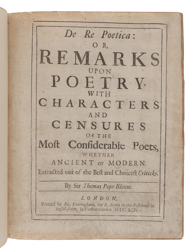 BLOUNT, Thomas Pope, Sir (1649-1697). De re Poetica: or, Remarks upon Poetry... London: Ric. Everingham for R. Bently, 1694. 4to. Modern morocco gilt. -- WYCHERLEY, William (1640?-1716). The Plain-Dealer. A Comedy. "The Plain-Dealer. As it is acted at the Theatre Royal." London: for R. Wellington and E. Rumbal, 1700. 4to. Modern half calf. Seventh edition. -- Together, 6 works in 6 volumes, condition generally good.