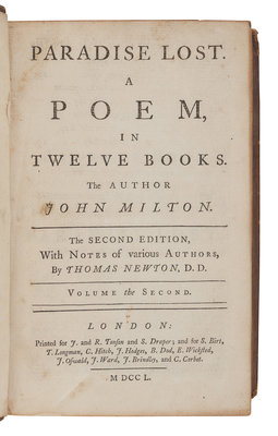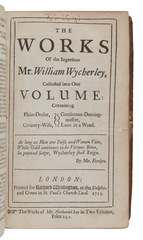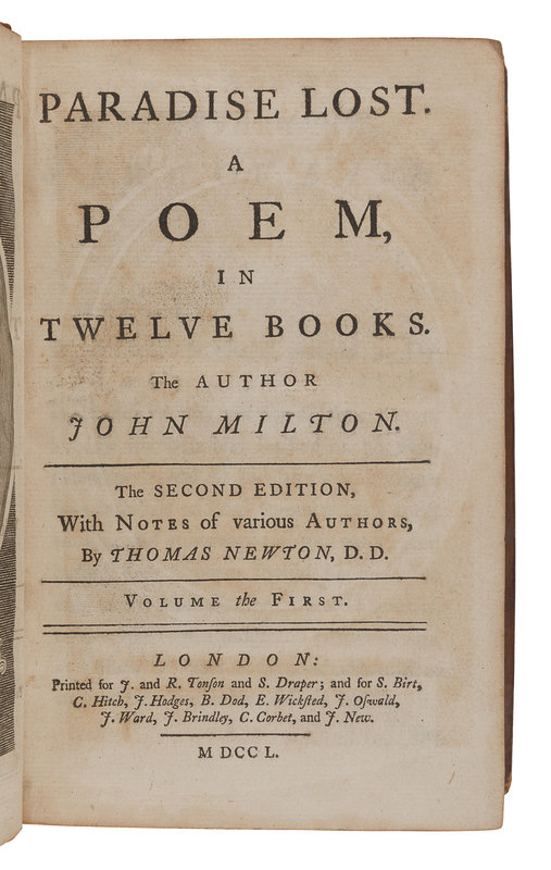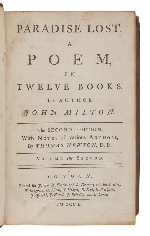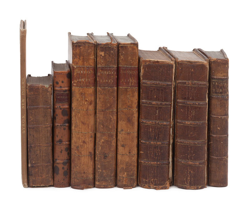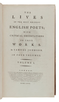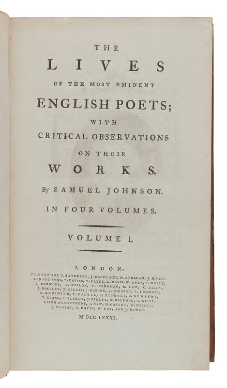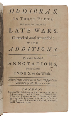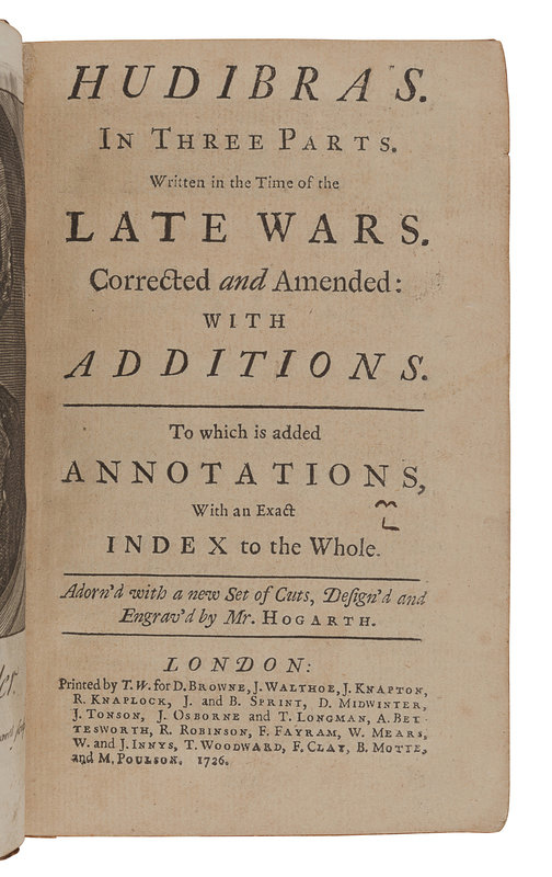 WYCHERLEY, William (1640?-1716). Works. London: for Richard Wellington, 1713. 8vo. 1p. publisher's advertisements. Contemporary calf. -- BUTLER, Samuel (1612-1680). Hudibras. London: T.W. for D. Browne, 1726. Illustrated by William Hogarth. 12mo. Contemporary panelled calf. Provenance: W. K. Scudamore (bookplate). -- MILTON, John (1608-1674). Paradise Lost -- Paradise Regain'd. London: for J. and R. Tonson and others, 1750-1753. 4 volumes in 2, 8vo. Engraved portrait frontispiece to vol. I. Contemporary calf (covers detaching). -- [JOHNSON, Samuel (1709-1784)]. Rasselas. The Prince of Abissinia. A Tale. London: W. Strahan, et al, 1775. 12mo. contemporary calf (rebacked). Fifth edition. -- JOHNSON, Samuel (1709-1784). The Lives of the Most Eminent English Poets. London: for C. Bathhurst and others, 1781. 3 volumes (of 4, lacking vol. IV), 8vo. Engraved portrait frontispiece. Contemporary calf (covers detaching). -- BYRON, George Gordon Noel, Lord (1788-1824). Poems on Domestic Circumstances. London: for J. Bumpus, 1816. 8vo. Stab-sewn; cloth folding case. Provenance: Esher (bookplate). -- Together, 6 works in 9 volumes, condition generally good.