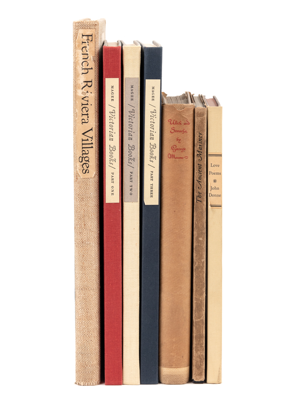 MOORE, George. Ulick and Soracha. London: The Nonesuch Press, 1926. 8vo. Original cloth; printed parchment dust jacket. Number 259 of 1250 copies. -- COLERIDGE, Samuel Taylor. The Rime of the Ancient Mariner. Oxford: Oxford University Press, 1930. 8vo. Original cloth-backed board; original plain dust jacket. One of 750 copies. -- DONNE, John. The Love Poems of John Donne. New Rochelle: The Peter Pauper Press, n.d. 8vo. Original cloth-backed boards. One of 1000 copies. -- Victoria R. I. San Francisco: Press of Robert Grabhorn and Andrew Hoyem for David Magee, 1970. 3 volumes, 4to. Original cloth-backed boards. One of 625 copies. -- [With:] THOMPSON, Virginia. French Riviera Villages. New York: Mitchell Kennerley, 1938. 4to. Original cloth. One of 1000 copies. -- Together, 5 works in 7 volumes, ALL LIMITED EDITIONS.