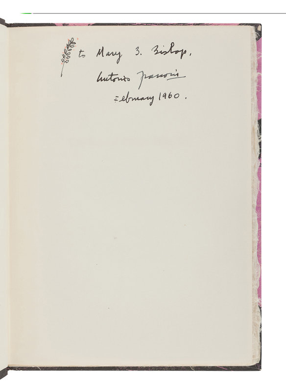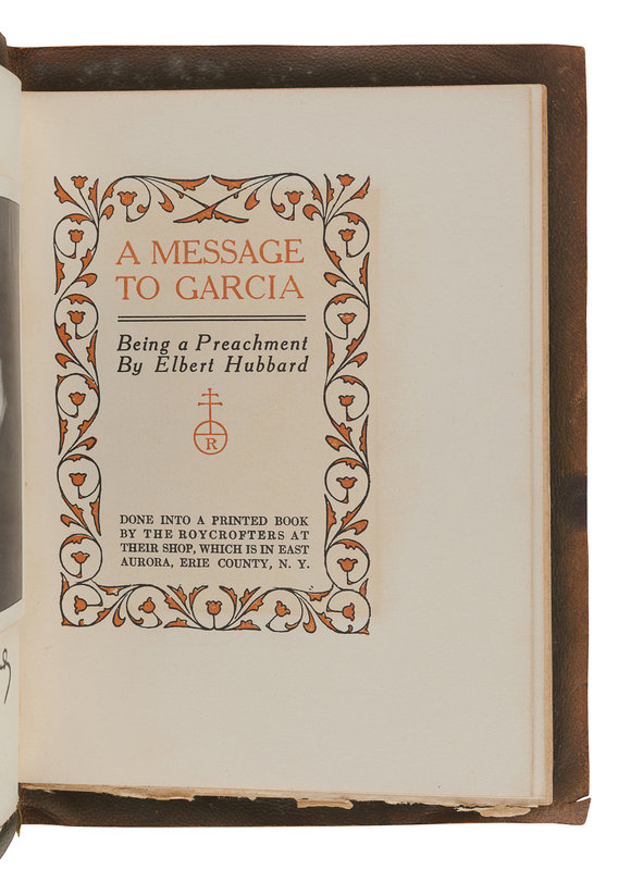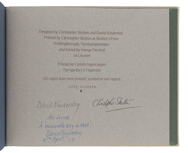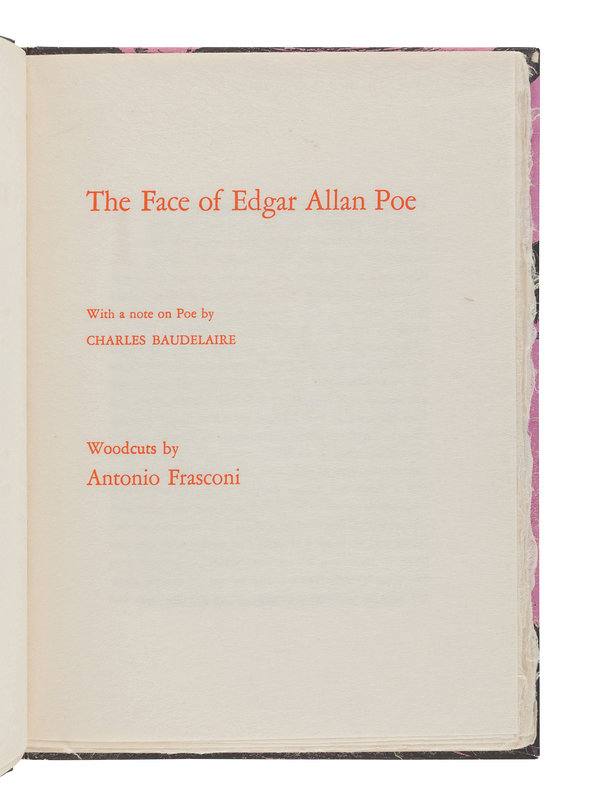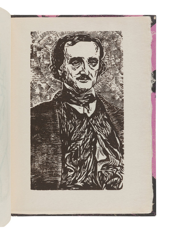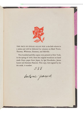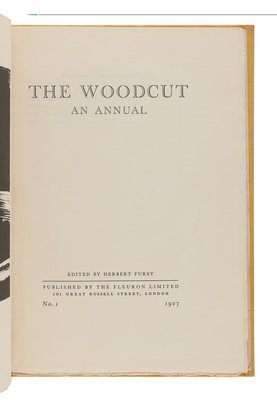 [ROYCROFTERS]. HUBBARD, Elbert. A Message to Garcia. East Aurora, New York: The Roycrofters, 1914. Original green suede binding (some toning); green silk doublures. FIRST EDITION. -- FURST, Herbert, editor. The Woodcut: An Annual. London: The Fleuron Limited, 1927-1929. Nos. I-III. 3 volumes, 4to. Later cloth. LIMITED EDITIONS of the “Special Edition”: no.I number 73 of 70 copies of a total edition of 75 copies; no.II and III number 10 and 69, respectively, of 75 copies of a total edition of 80 copies. -- FRASCONI, Antonio. The Face of Edgar Allan Poe. South Norwalk, CT: N.p., 1959. 11 original woodcuts. Original printed boards. LIMITED EDITION, number 237 of 250 copies SIGNED AND INSCRIBED BY FRASCONI. -- KINDERSLEY, David. Graphic Sayings. Cambridge: N.p., 1972. Oblong 4to. Title and sixteen designs of sayings or proverbs on different coloured papers by Kindersley, additional suite of 16 plates on Japanese paper loosely inserted in pocket at end. Original morocco-backed cloth gilt; glassine, printed board slipcase. LIMITED EDITION, number 8 of 130 copies SIGNED BY KINDERSLEY AND the printer Christopher Skelton. -- Together, 4 works in 6 volumes, 4to or smaller, ALL FIRST OR LIMITED EDITIONS, most original publisher’s bindings where indicated, condition generally fine.