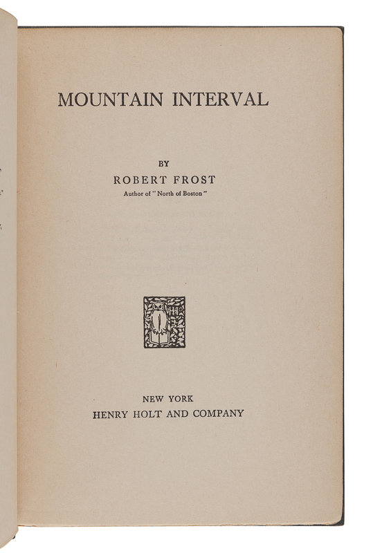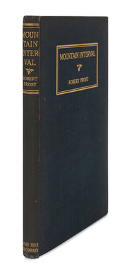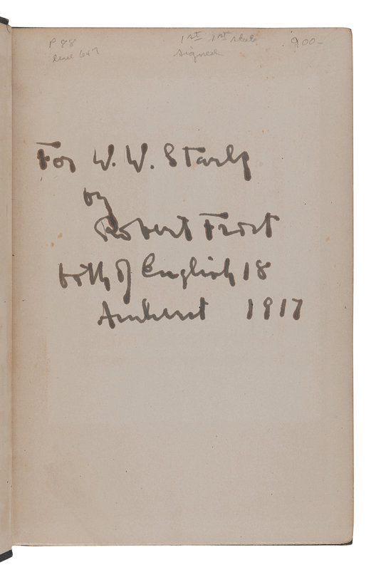 FIRST EDITION, FIRST ISSUE, PRESENTATION COPY, SIGNED BY FROST, "For W.W. Stark by Robert Frost both of English 18 Amherst 1917." With lines 6 and 7 repeating on p.88, and "Come" (later changed to "Gone") on p.93. Mountain Interval includes the first appearance of "The Road Not Taken" in a Frost book. Crane A4.