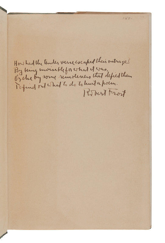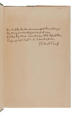 Later edition, SIGNED BY FROST WITH A 4-LINE QUOTATION from his poem, "A Fountain, a Bottle, a Donkey's Ears, and Some Books": "How had the tender verse escaped their outrage?/ By being invisible for what it was,/ Or else by some remoteness that defied them/ To find out what to do to hurt a poem."