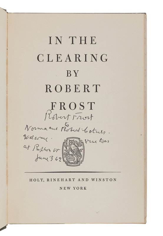 FIRST TRADE EDITION, LESLEY FROST"S COPY, PRESENTATION COPY, INSCRIBED BY FROST: "Robert Frost to Norma and Robert Cotner. Welcome visitors at Ripton VT June 3 62." Crane A41.1