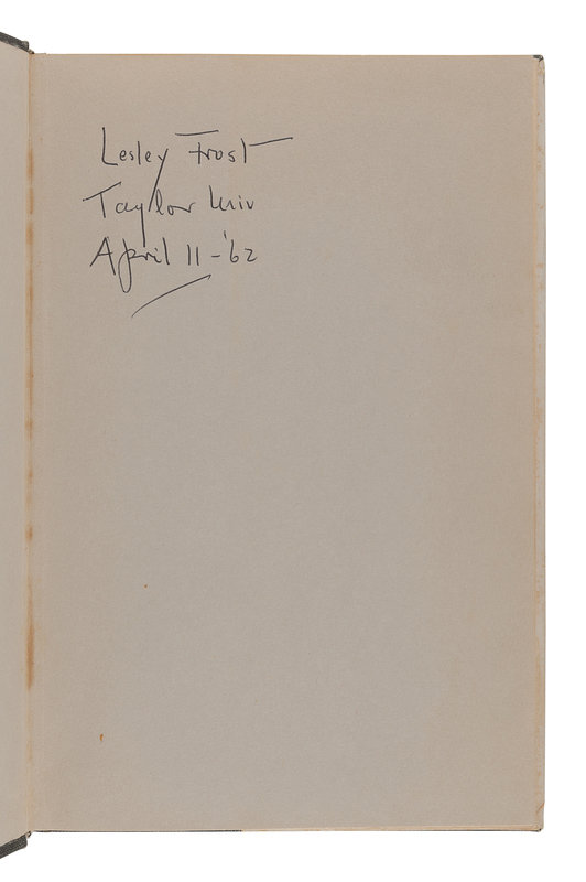 8vo. Original publisher’s slate-gray cloth stamped in silver (corners very slightly bumped); original printed dust-jacket (creasing and tearing to extremities; slight soiling to rear jacket; very minor spotting to dust jacket flaps). Provenance: Lesley Frost (1899-1983), Robert Frost's daughter (ownership signature, Taylor Univ, 11 April 1962); Norma and Robert Cotner (presentation inscription).