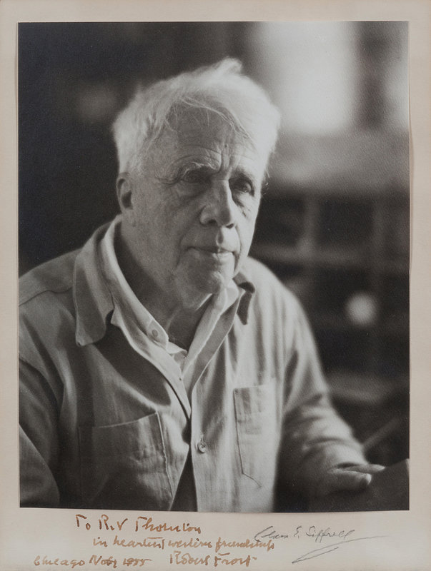 SIGNED AND INSCRIBED BY FROST TO R.V. THORNTON in ink lower mount margin: "To R.V Thornton in heartiest western friendship Robert Frost Chicago Nov 1955."