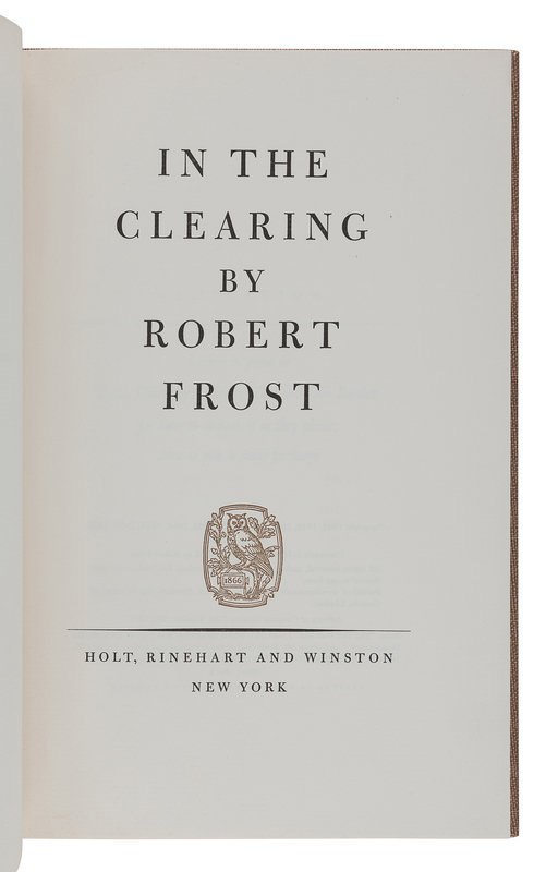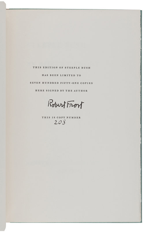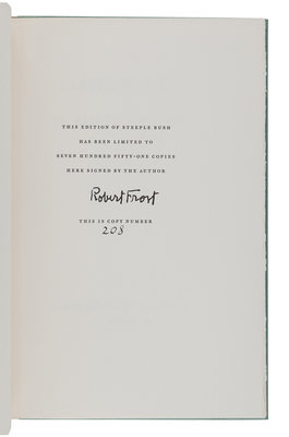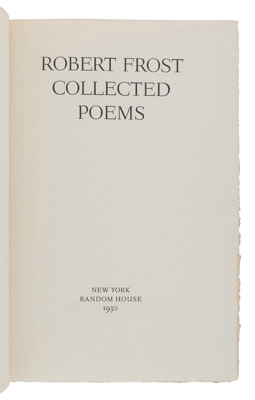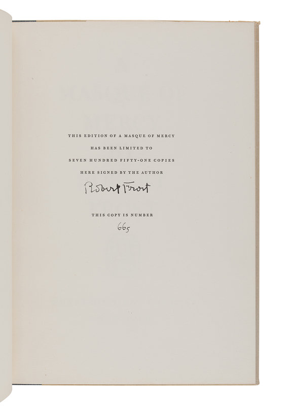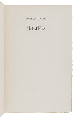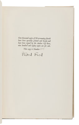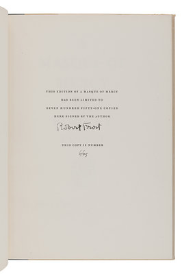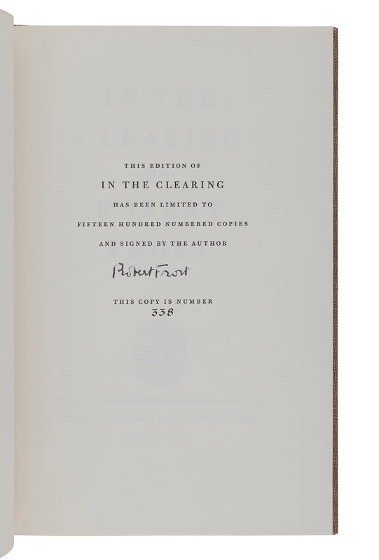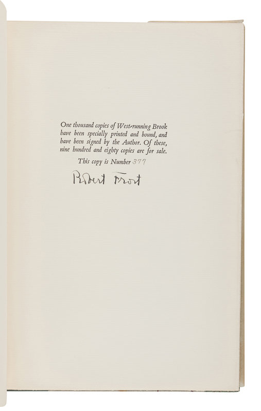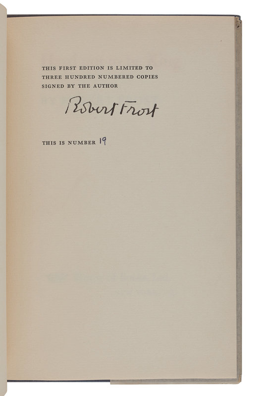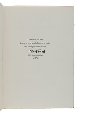 West-Running Brook. New York: Henry Holt, 1928. Number 377 of 1000 copies. -- Robert Frost. Collected Poems. New York: Random House, 1930. Number 490 of 1,000 copies. -- A Masque of Reason. New York: Henry Holt and Company, 1945. Slipcase. Number 585 of 800 copies. -- A Masque of Mercy. New York: Henry Holt and Company, 1947. Slipcase. Number 665 of 751 copies. -- Steeple Bush. New York: Henry Holt and Company, 1947. Slipcase. Number 208 of 751 copies. -- Hard not to be King. New York: House of Books, Ltd., 1951. Number 19 of 300 copies. -- In the Clearing. New York: Holt, Rinehart and Winston, 1962. Slipcase. Number 330 of 1500 copies. -- Together, 7 works in 7 volumes, 8vo, ALL FIRST EDITIONS, LIMITED ISSUES, SIGNED BY FROST, all in original publisher’s cloth or cloth-backed boards, slipcases where noted, condition generally fine.