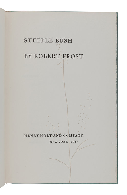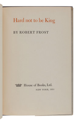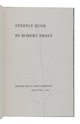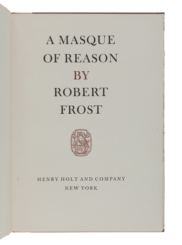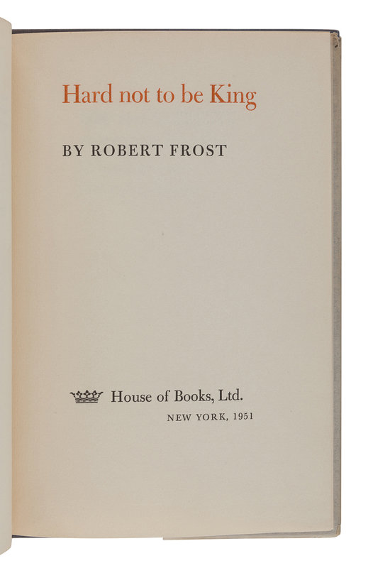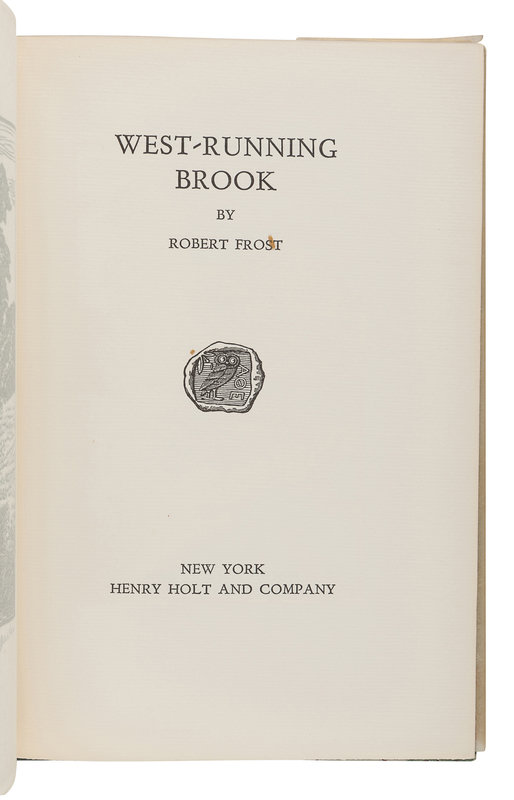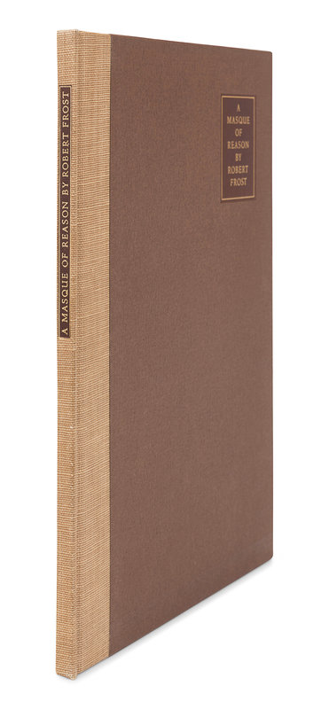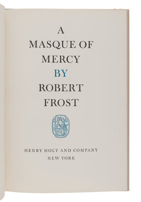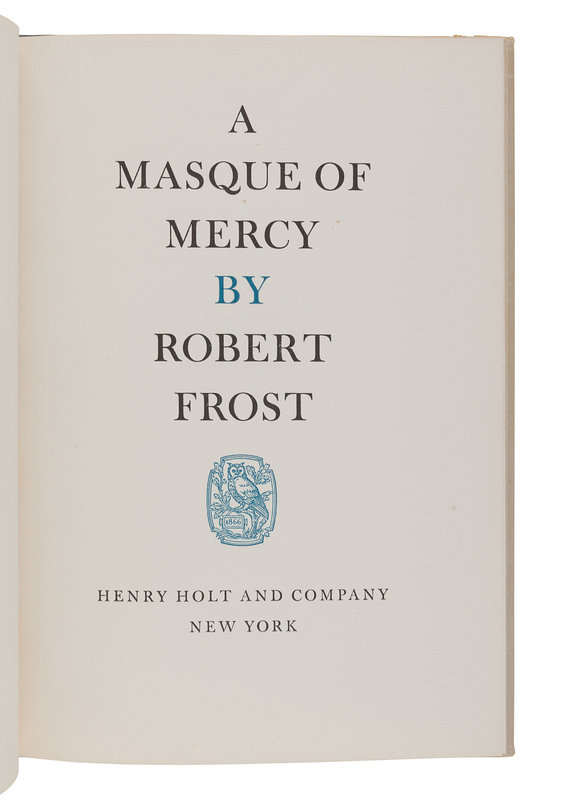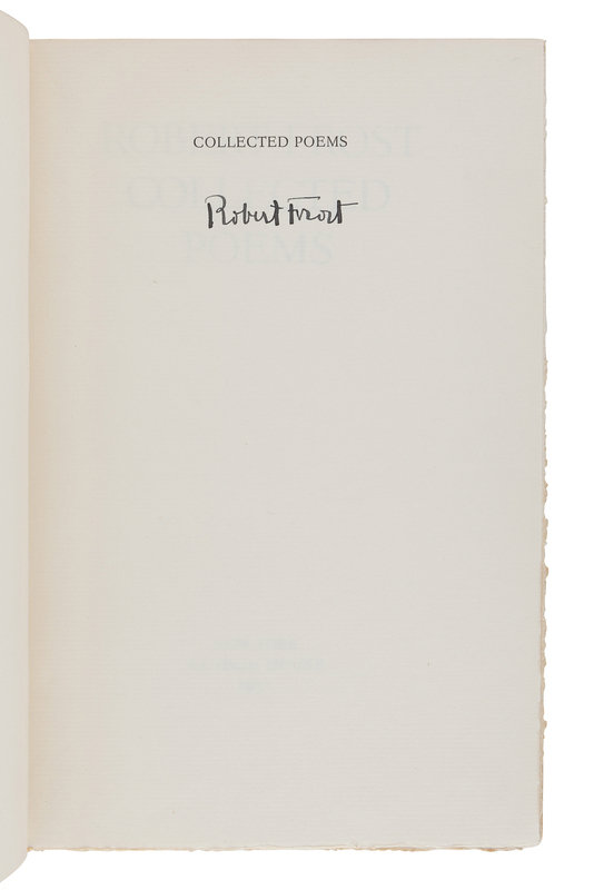 West-Running Brook. New York: Henry Holt, 1928. Number 377 of 1000 copies. -- Robert Frost. Collected Poems. New York: Random House, 1930. Number 490 of 1,000 copies. -- A Masque of Reason. New York: Henry Holt and Company, 1945. Slipcase. Number 585 of 800 copies. -- A Masque of Mercy. New York: Henry Holt and Company, 1947. Slipcase. Number 665 of 751 copies. -- Steeple Bush. New York: Henry Holt and Company, 1947. Slipcase. Number 208 of 751 copies. -- Hard not to be King. New York: House of Books, Ltd., 1951. Number 19 of 300 copies. -- In the Clearing. New York: Holt, Rinehart and Winston, 1962. Slipcase. Number 330 of 1500 copies. -- Together, 7 works in 7 volumes, 8vo, ALL FIRST EDITIONS, LIMITED ISSUES, SIGNED BY FROST, all in original publisher’s cloth or cloth-backed boards, slipcases where noted, condition generally fine.