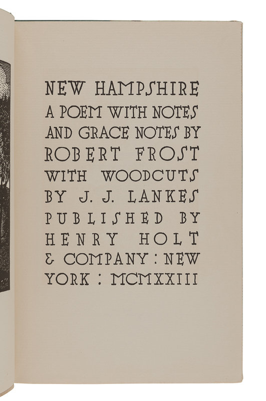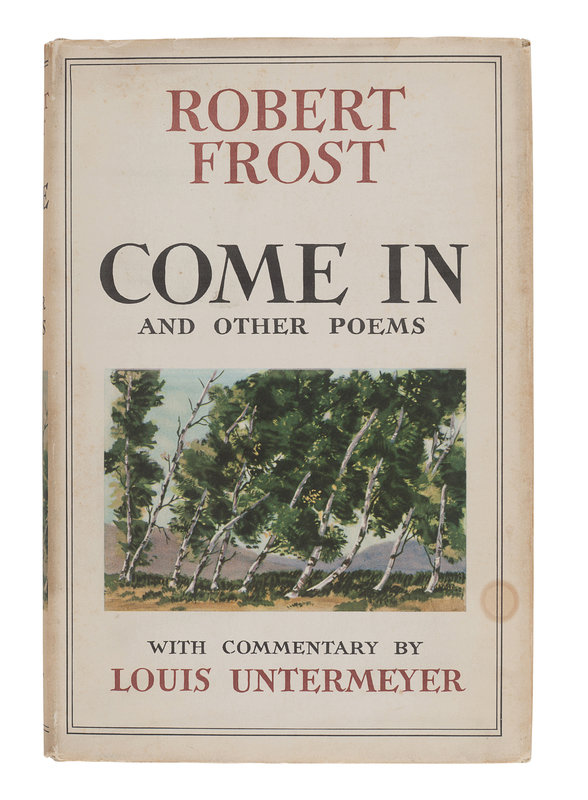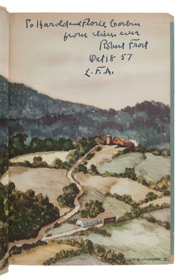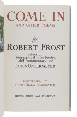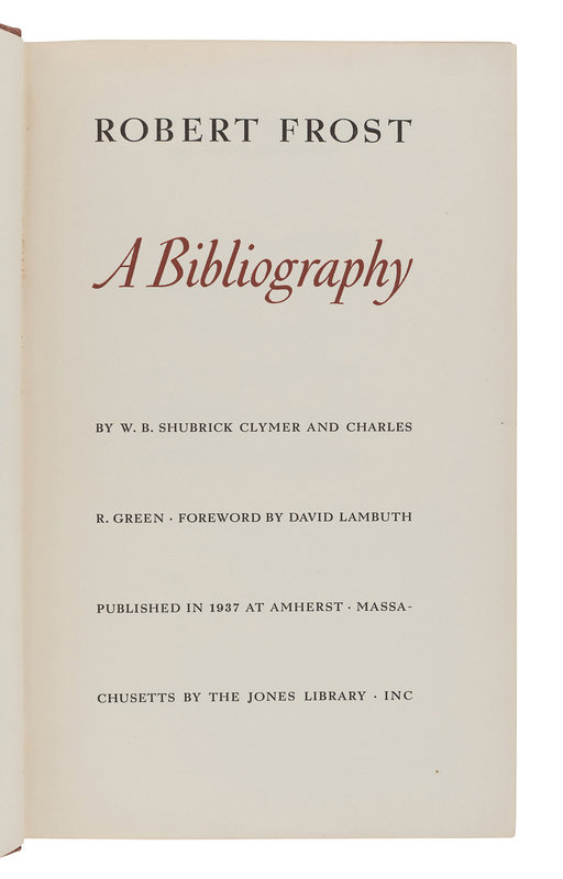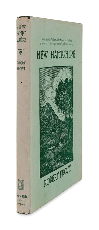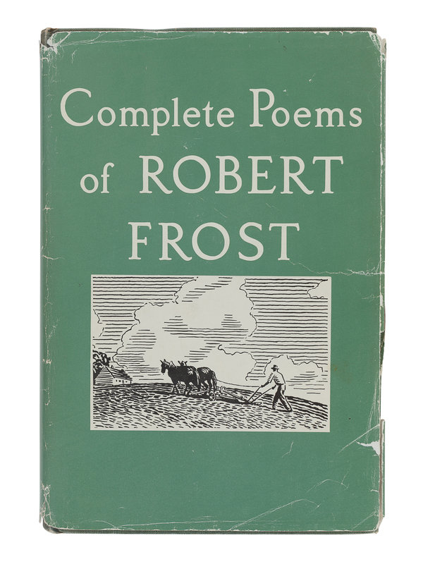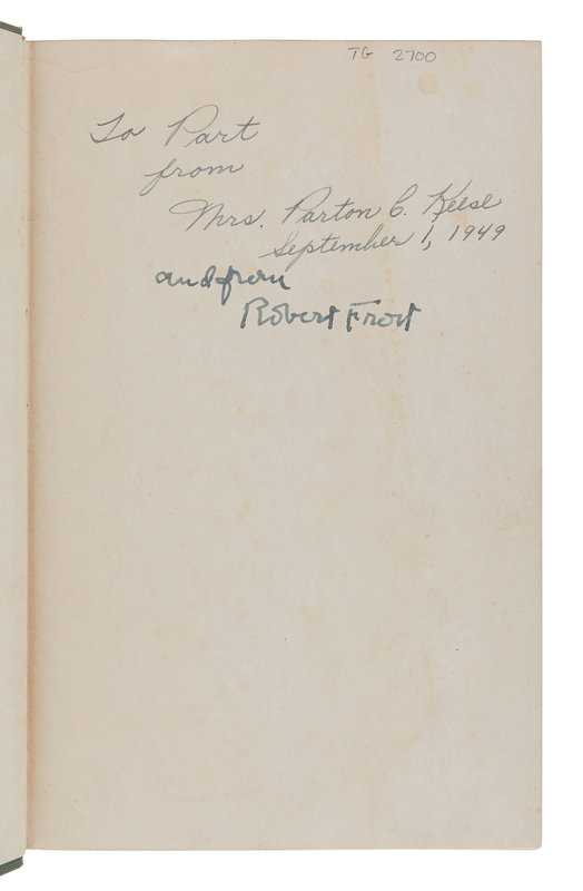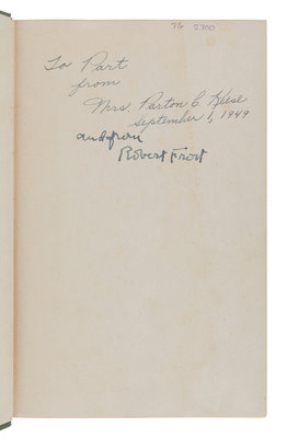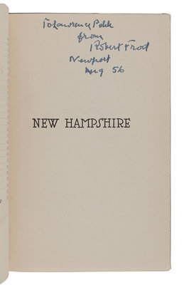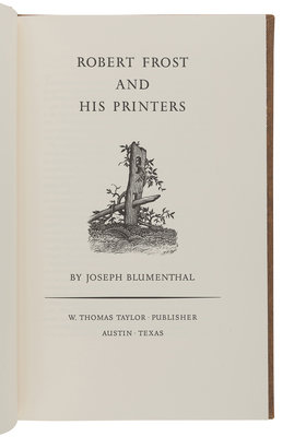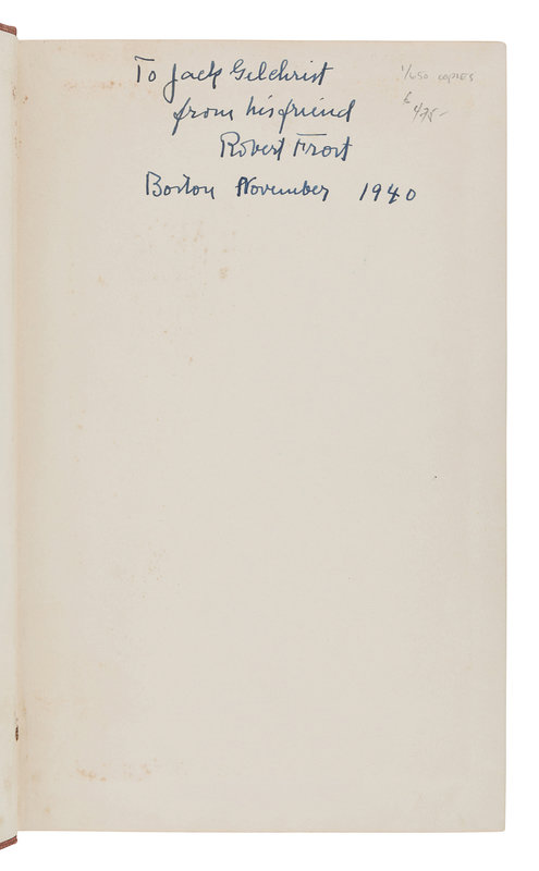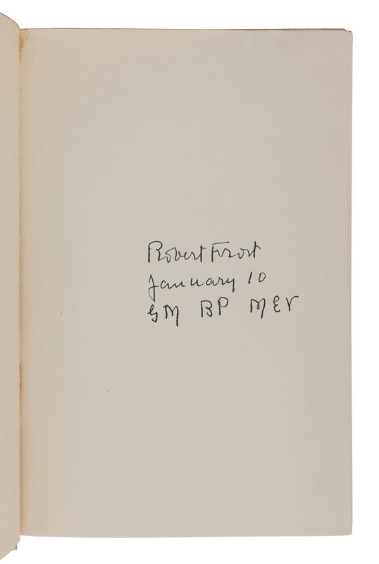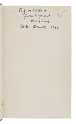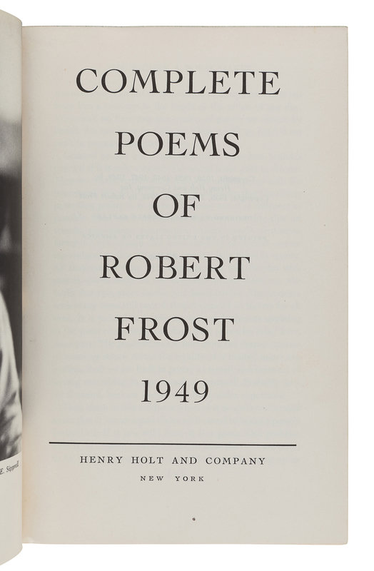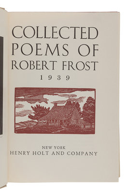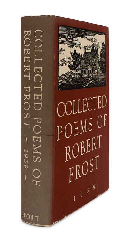 FROST, Robert. New Hampshire. New York: Henry Holt & Company, 1936. Dust jacket. Later edition. INSCRIBED BY FROST to Lawrence Polek, Newport, August 1956. Provenance: Lawrence [Polek] (gift inscription, Dec. 1953). -- FROST, Robert. Collected Poems of Robert Frost. New York: Henry Holt and Company, 1939. Dust jacket. FIRST EDITION, FIRST PRINTING. INSCRIBED BY FROST: "Robert Frost January 10 GM BP MER". -- CLYMER, W.B. Shubrick. – GREEN, Charles R. Robert Frost: A Bibliography. Amherst, MA: Jones Library Inc., 1937. INSCRIBED BY FROST to Jack Gilchrist, Boston, November 1940. -- FROST, Robert. Complete Poems of Robert Frost 1949. New York: Henry Holt and Company, 1949. Dust jacket. FIRST EDITION, FIRST PRINTING. INSCRIBED BY FROST. -- FROST, Robert. Come In and Other Poems. New York: Henry Holt and Company, 1943. Dust jacket. Provenance: Lee? (gift inscription 1943); Harold Corbin (bookplate). FIRST EDITION, FIRST PRINTING. INSCRIBED BY FROST to Harold and Florie Corbin, 18 October 1957. -- Together, 5 works in 5 volumes, 8vo, some first editions where indicated, all in original publisher’s cloth, cloth-backed boards or printed boards, with dust jackets where indicated, condition generally fine. [With:] BLUMENTHAL, Joseph. Robert Frost and his Printers. Austin, TX: W. Thomas Taylor, 1985. Original cloth-backed boards; original slipcase. FIRST EDITION.
