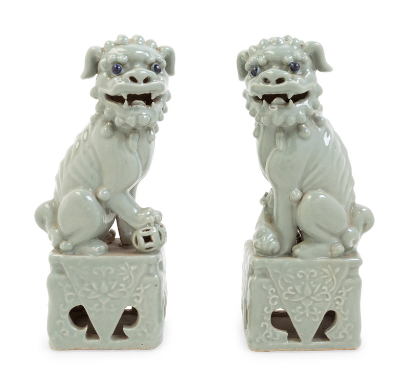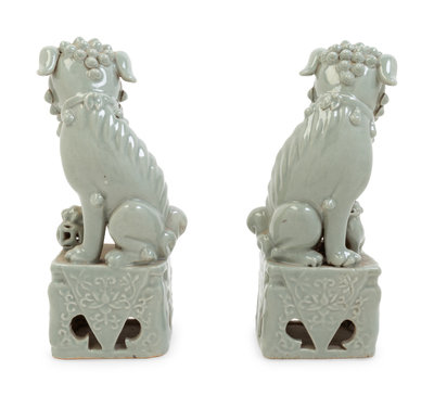 A Pair of Chinese Blue Glazed Porcelain Figures of Fu Lions