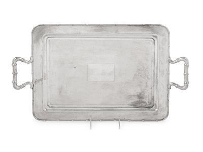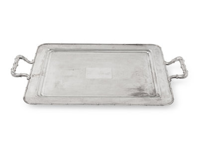 of rectangular from with softly rounded corners, the surface hammered to a dappled finish, bordered by edges and handles worked to imitate smooth bamboo; marked 'HC' and '其昌' to underside.