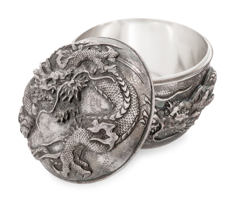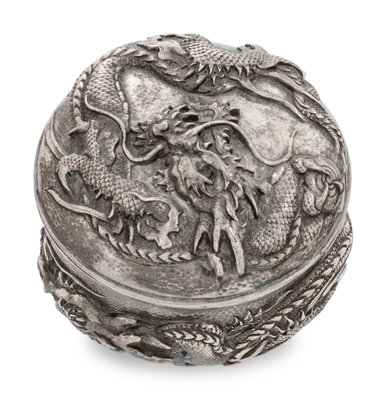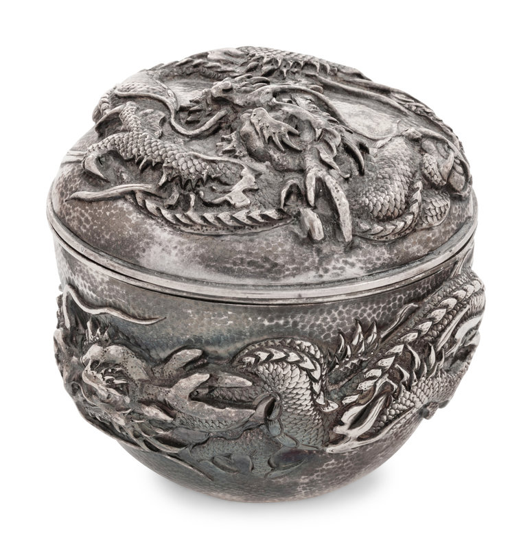 of slight globular form with a narrowed flat foot, fitted with a conforming lid above a smooth liner, and the exterior chased in high relief to show two dragons against a hammered ground; marked '纯银' to underside.