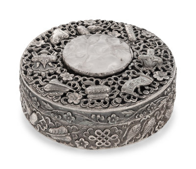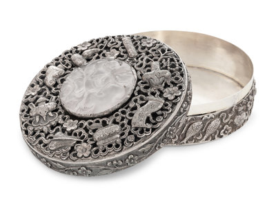 A Chinese Export Rose Quartz Inset Silver Covered Box